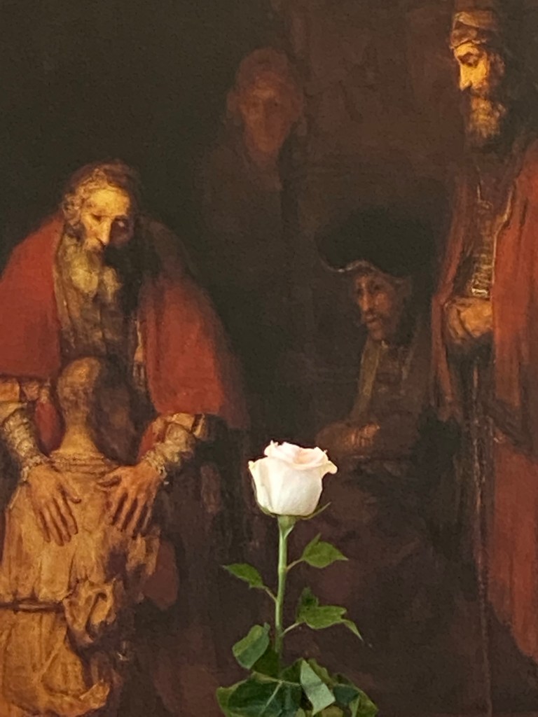 Serious post. I am glad I went to class and had the opportunity to contemplate on this Rembrandt painting of “The Return of the Prodigal Son.” I saw something in it that illustrated what went through my mind when listening to Beth Barr speak on complementarian theology.