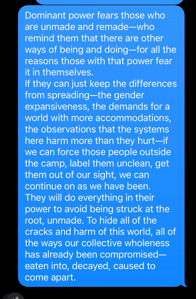 Y‘All, when I read that verse, I could see the gates of heaven open up to me. Jesus agrees with me. If we are going to do any meaningful work together, we have to be friends. This means we need deep trust in ourselves and with each other. Our servant-style leadership that likes to keep secrets and disconnect is literally killing us spiritually, and sometimes physically too. It keeps a power structure in place that is more authoritative than it is harmonious and responsible. The authoritative approach actually only demands responsibility from those without power. This is why we keep getting abused.