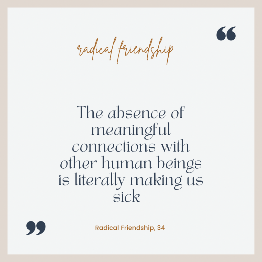 But when friendships are weak, the cost isn’t limited to our personal health. Families, communities, and even social movements become more vulnerable to outside stressors when friendships erode. Talking to the healing and justice director at Black Lives Matter Global Network, they said this: “how we protect and care for each other along the way (to liberation), how we come through connected and stronger at the other end, are possibly the most critical and meaningful questions we face.”