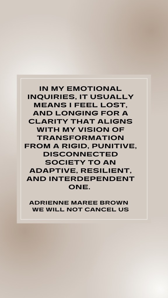 I am reading a book called “We Will Not Cancel Us” by adrienne maree brown and she is talking about abolition. But abolition is not about absence, it is about presence. It is about building life-affirming institutions (Ruth Wilson Gilmore) We need to address harm at the root so we can grow into right relationship with each other.