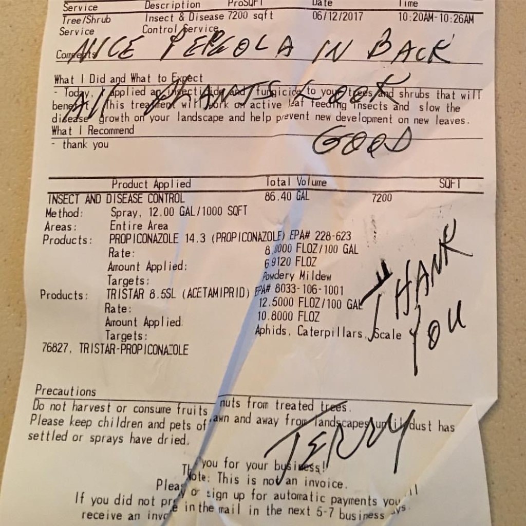 I’m including a note from TruGreen that Terry wrote a few years ago. He always said something encouraging. I can’t find the pic where he said: Nice Sign. He was referencing my “We Welcome Refugees” sign.